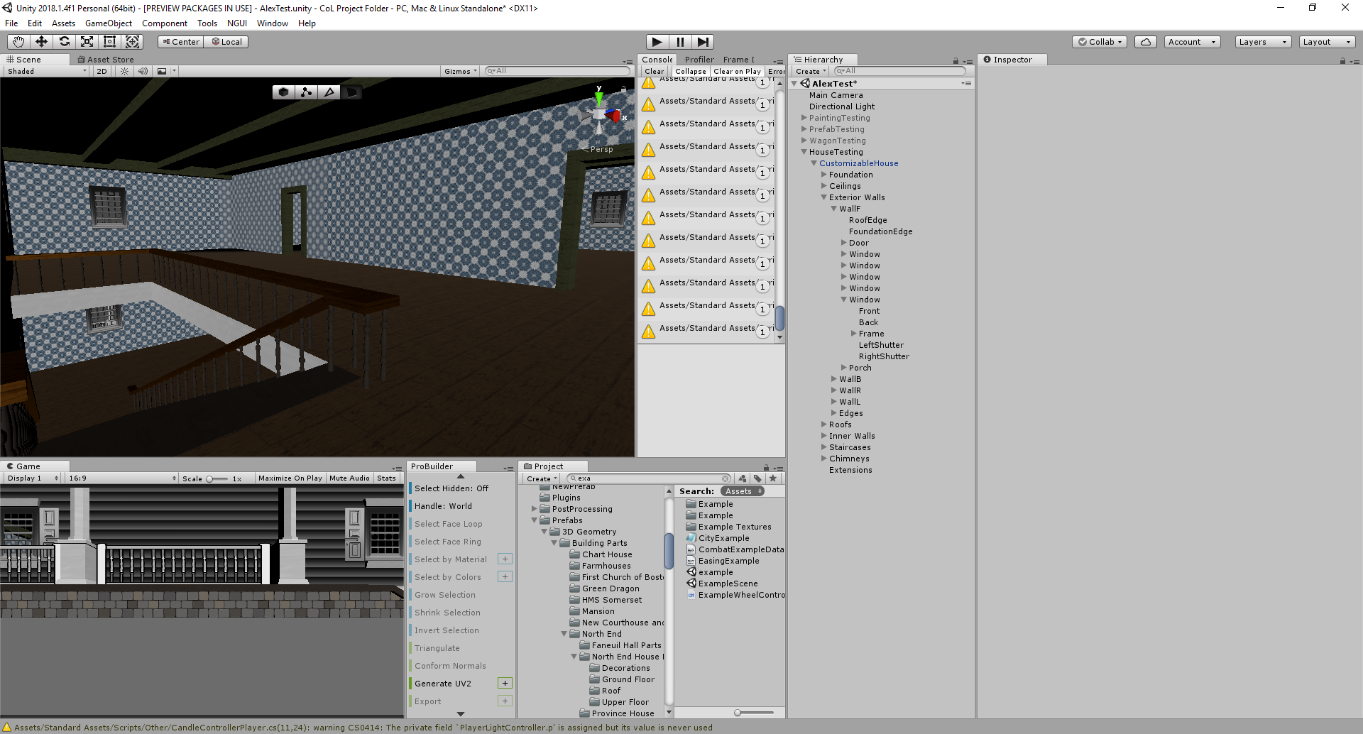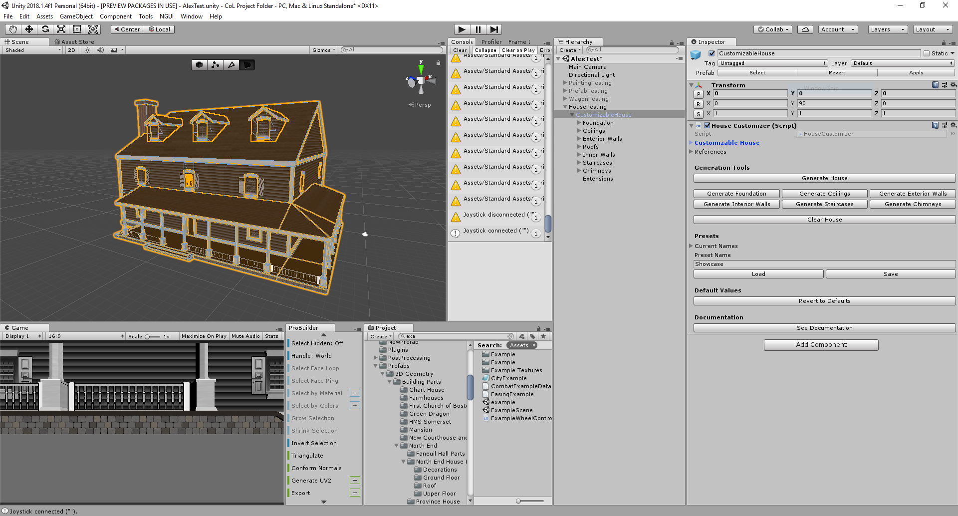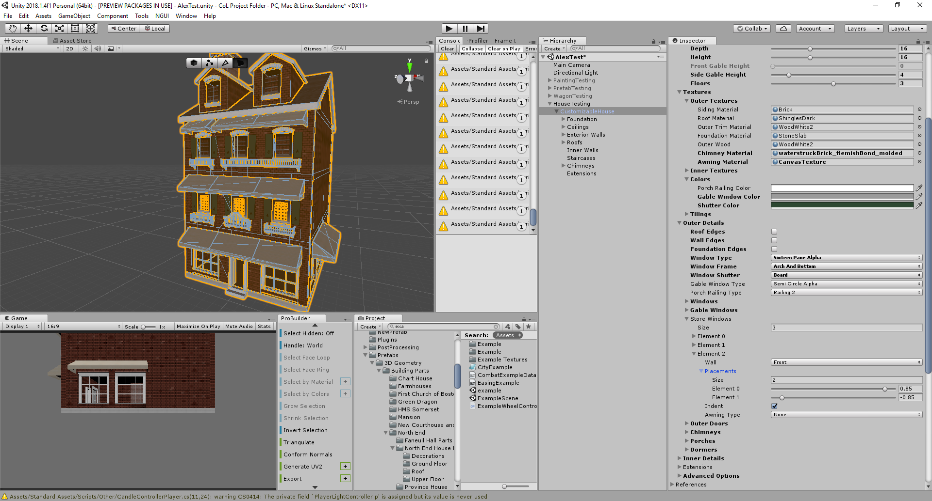 To achieve this task, I created a fully fledged house customization tool, using the rather limited Pro-Builder API to create the necessary meshes. Doing this, I learned a lot about how to create editor tools, and created a few custom editor tricks along the way (such as a script that could hide or show serializable fields based on the value of getters in either that object or the class containing the object).